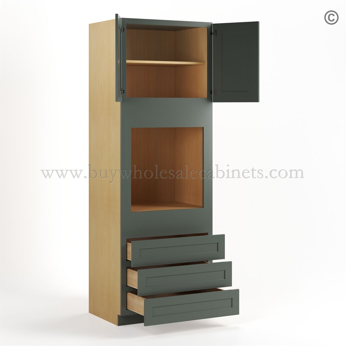 Our Green Shaker 30 W Oven Pantry Cabinet is 30″ Wide, 24″ Deep, and available in 3 heights. This cabinet features two doors, one large open shelf, and three bottom drawers. This cabinet Green will fit perfectly in your kitchen or bathroom. The brilliant shade of shaker green cabinet will make your rooms exude modernity and quality.