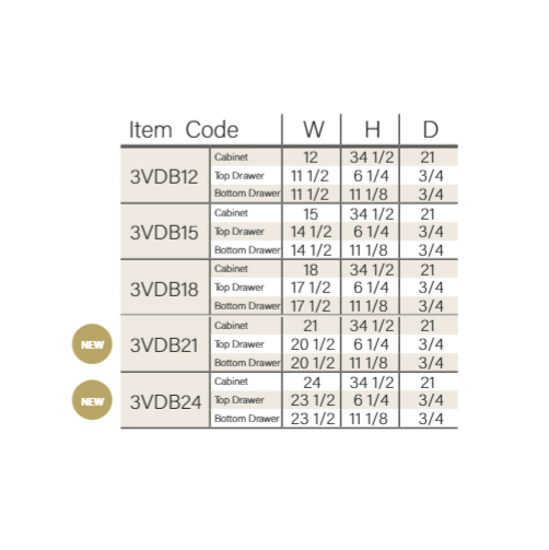 Cabinet Dimensions: 12″W x 34 1/2″H x 21″D, 15″W x 34 1/2″H x 21″D, 18″W x 34 1/2″H x 21″D, 21″W x 34 1/2″H x 21″D, 24″W x 34 1/2″H x 21″D