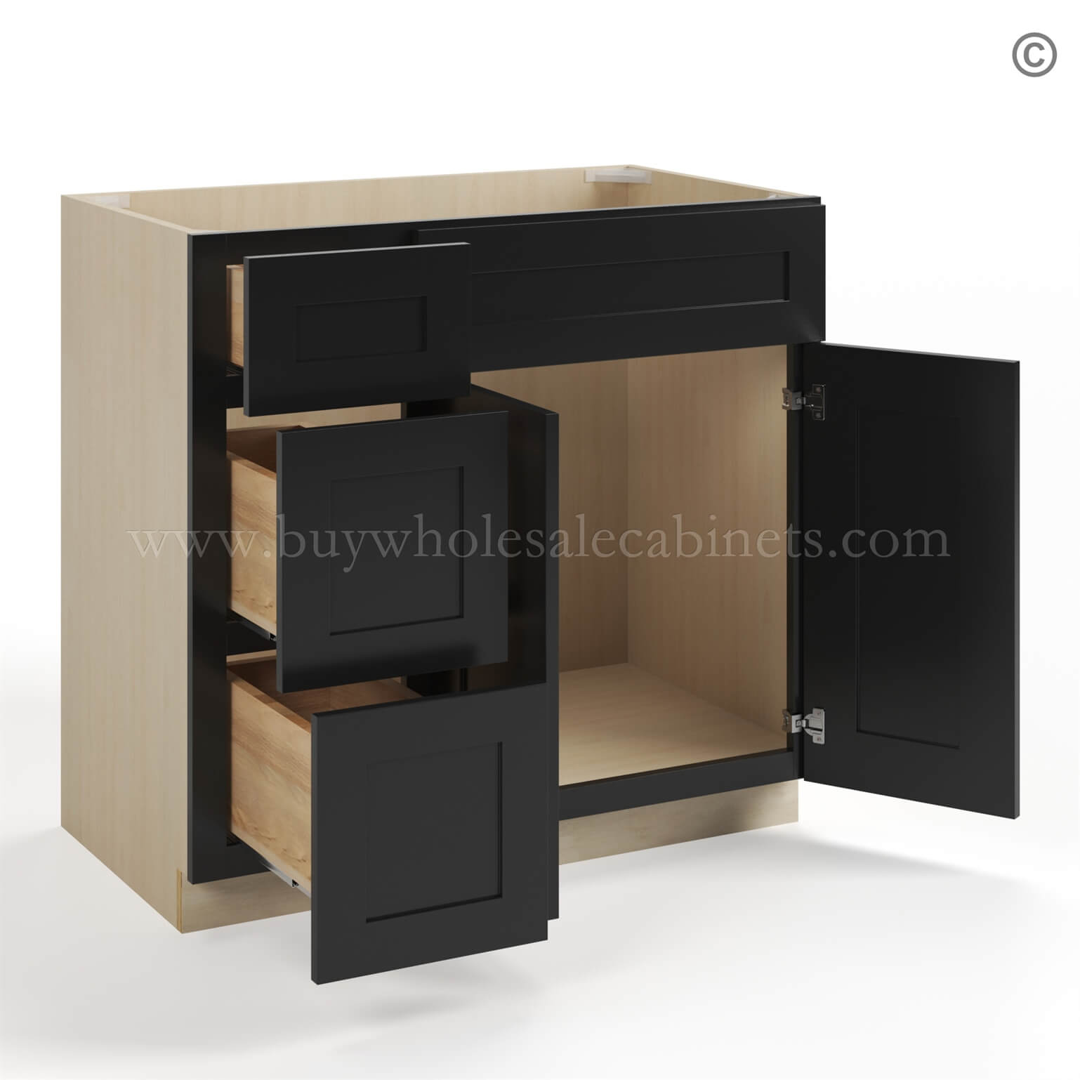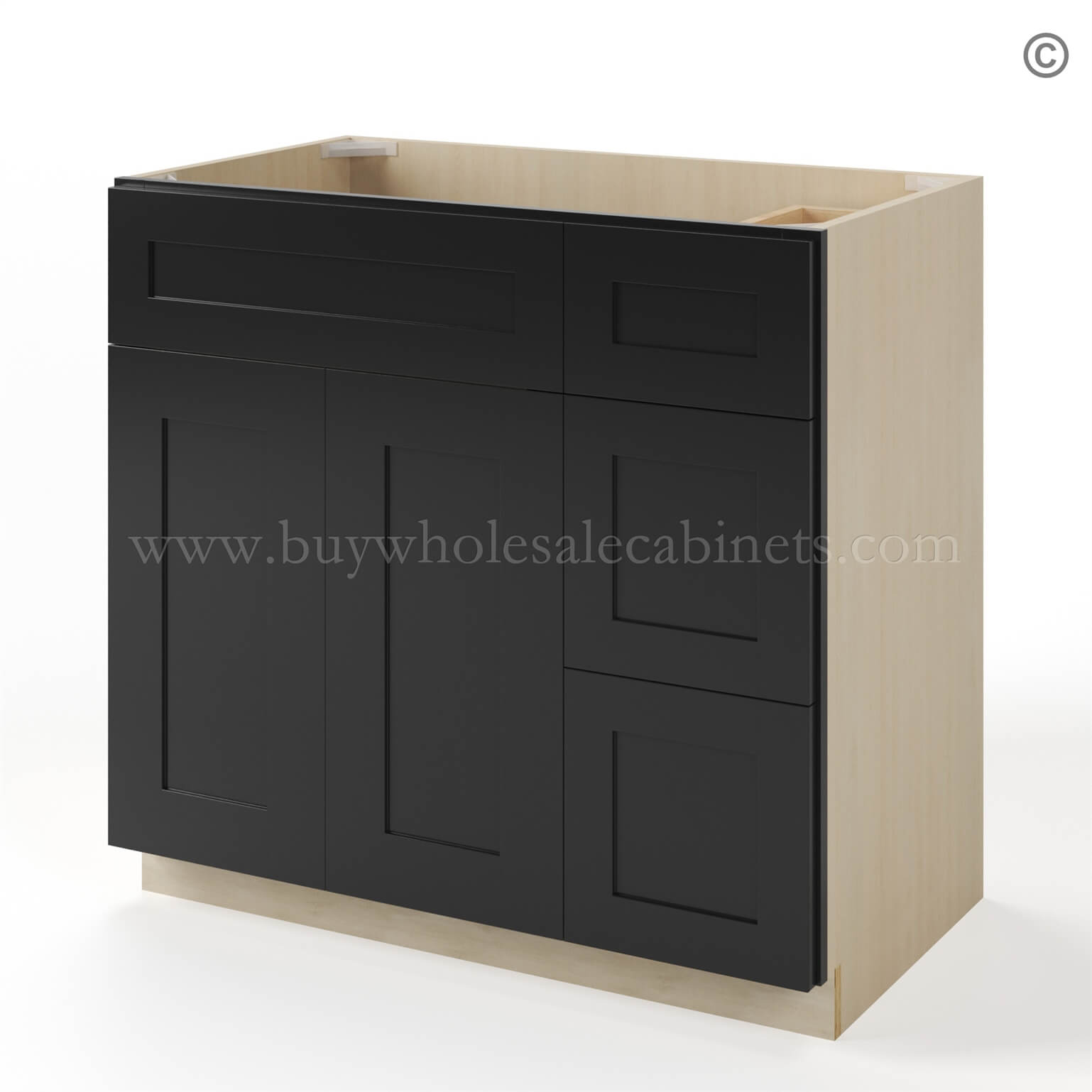 Our Black Shaker 36 W Vanity Combo Drawer with Drawers is 34.5″ Tall, 21″ Deep, and 36″ Wide. This cabinet features 3 drawers and is available with drawers on the right or left side. This shaker Black cabinet will fit perfectly in your kitchen or bathroom. The brilliant shade of Charleston White cabinets will make your rooms exude modernity and quality.