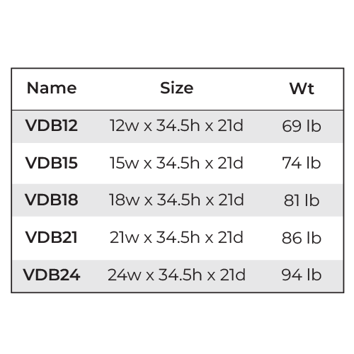 | Size | 12″W x 34 1/2″H x 21″D, 15″W x 34 1/2″H x 21″D, 18″W x 34 1/2″H x 21″D, 21″W x 34 1/2″H x 21″D, 24″W x 34 1/2″H x 21″D |