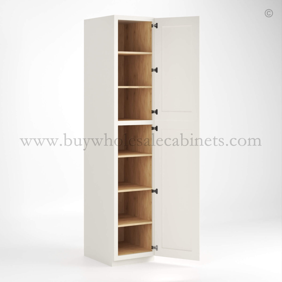 Our Charleston White Raised Panel Charleston White Raised Panel 18 W Two Single Door Utility Pantry Cabinet is 18″ wide, 24″ deep, and available in 3 heights (84″, 90″, 96″).