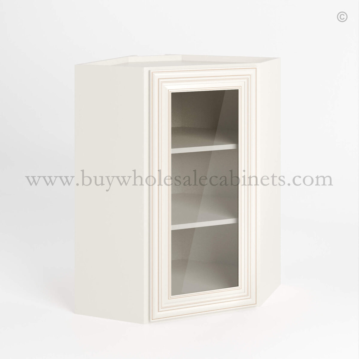 Our 24″ Charleston White Raised Panel Diagonal Corner Wall Cabinet with Glass Door is available in 3 sizes.