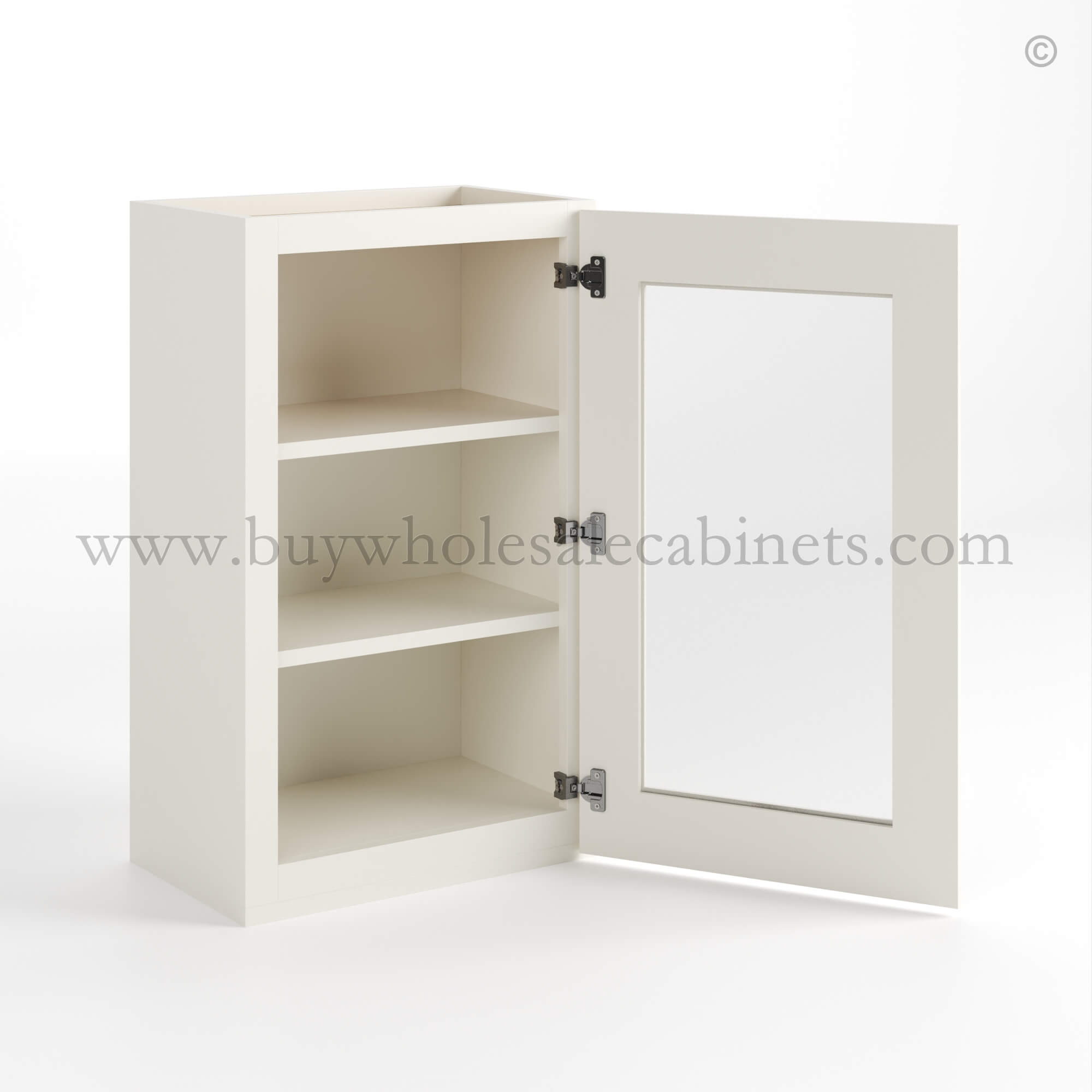 Our Charleston White Raised Panel 36 H Single Door Wall Cabinet with Glass Door is 36″ tall, 12″ deep and available in 2 widths (15″, 18″).
