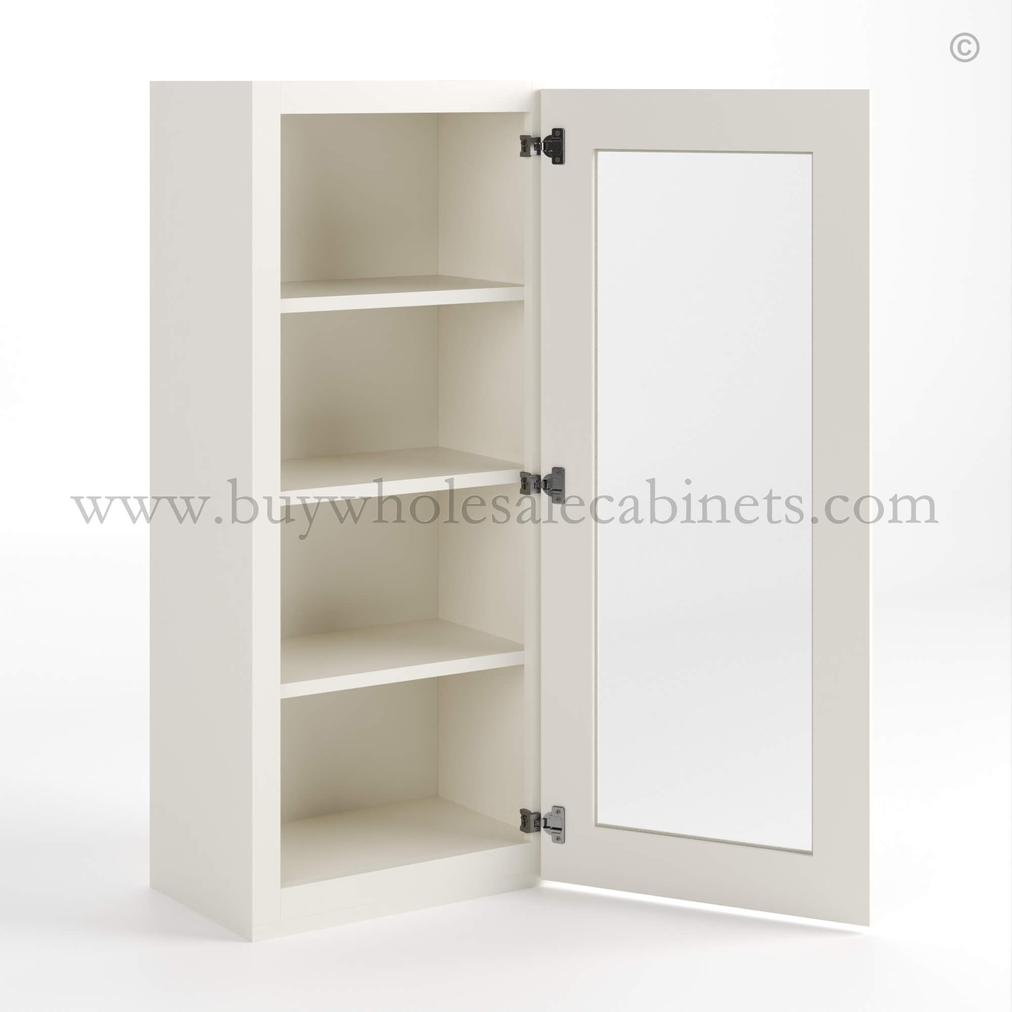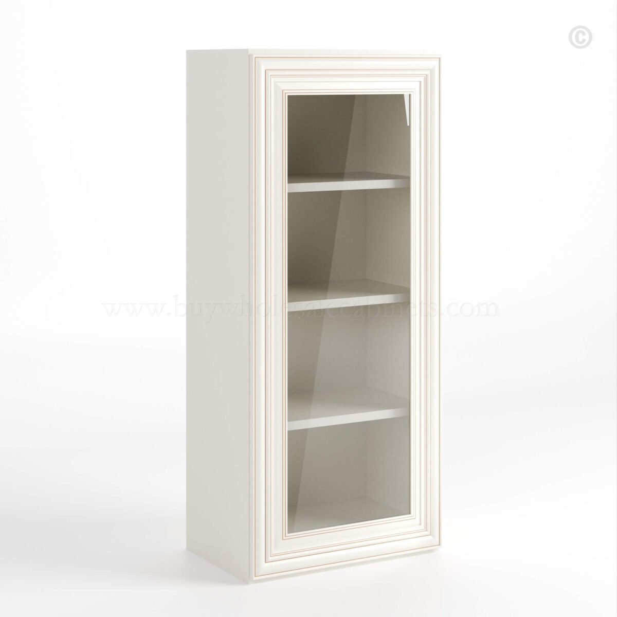 Our Charleston White Raised Panel 42 H Single Door Wall Cabinet with Glass Door is 42″ tall, 12″ deep, and available in 2 widths (15″, 18″).