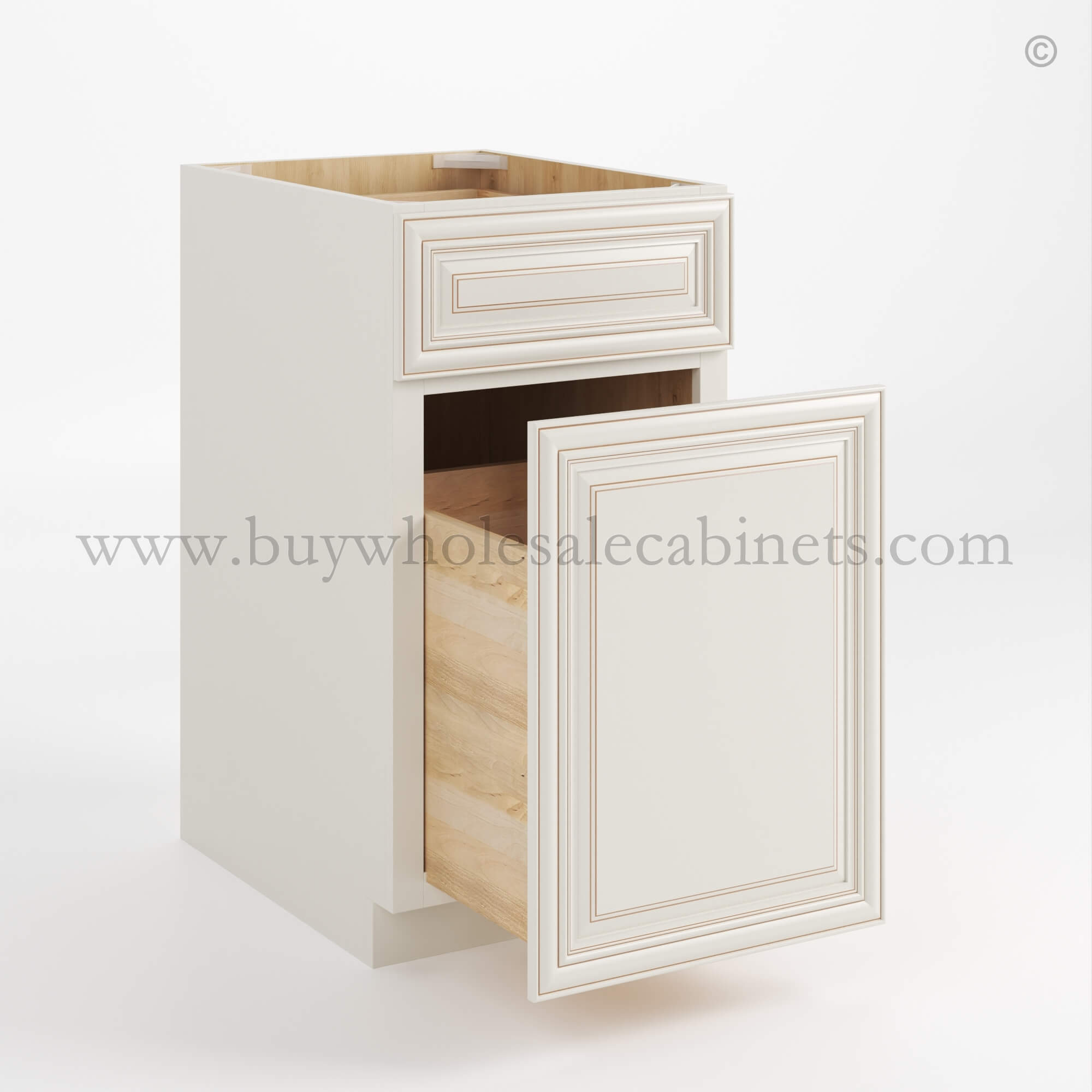 Designed for your convenience, this Raised Panel Charleston White trash base cabinet features European soft-close full extension drawer glides, ensuring smooth and quiet operation every time.