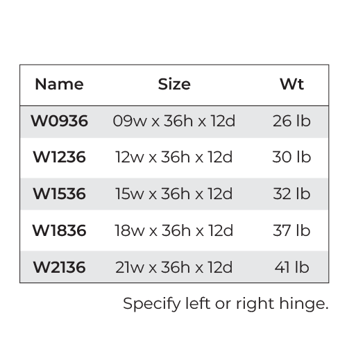 Size12″W x 36″H x 12″D, 15″W x 36″H x 12″D, 18″W x 36″H x 12″D, 21″W x 36″H x 12″D, 9″W x 36″H x 12″D