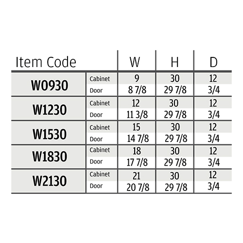 Size12″W x 30″H x 12″D, 15″W x 30″H x 12″D, 18″W x 30″H x 12″D, 21″W x 30″H x 12″D, 9″W x 30″H x 12″D