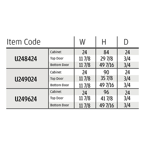 Size24″W x 84″H x 24″D, 24″W x 90″H x 24″D, 24″W x 96″H x 24″D