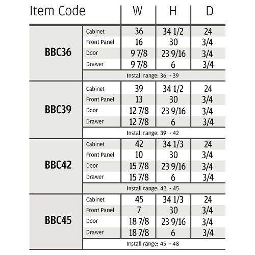 | Size | 36″W x 34-1/2″H x 24″D, 39″W x 34-1/2″H x 24″D, 42″W x 34-1/2″H x 24″D, 45″W x 34-1/2″H x 24″D |
