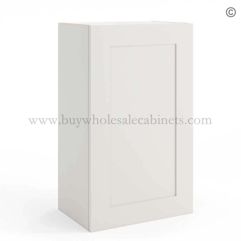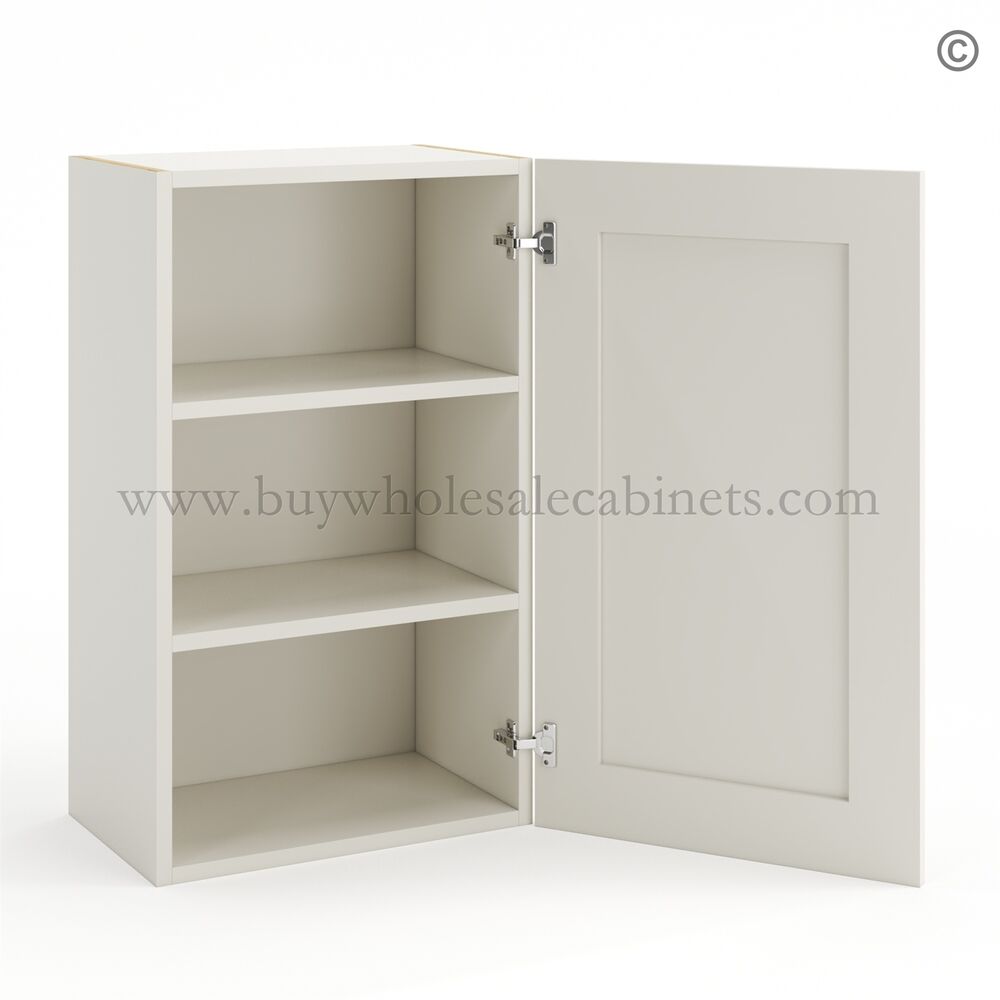 Frameless Pearl White 30″ Deep Wall Cabinet with 1 Door 2 Shelves is 30″ tall, 12″ deep, and available in five widths (9″, 12″, 15″, 18″, 21″).