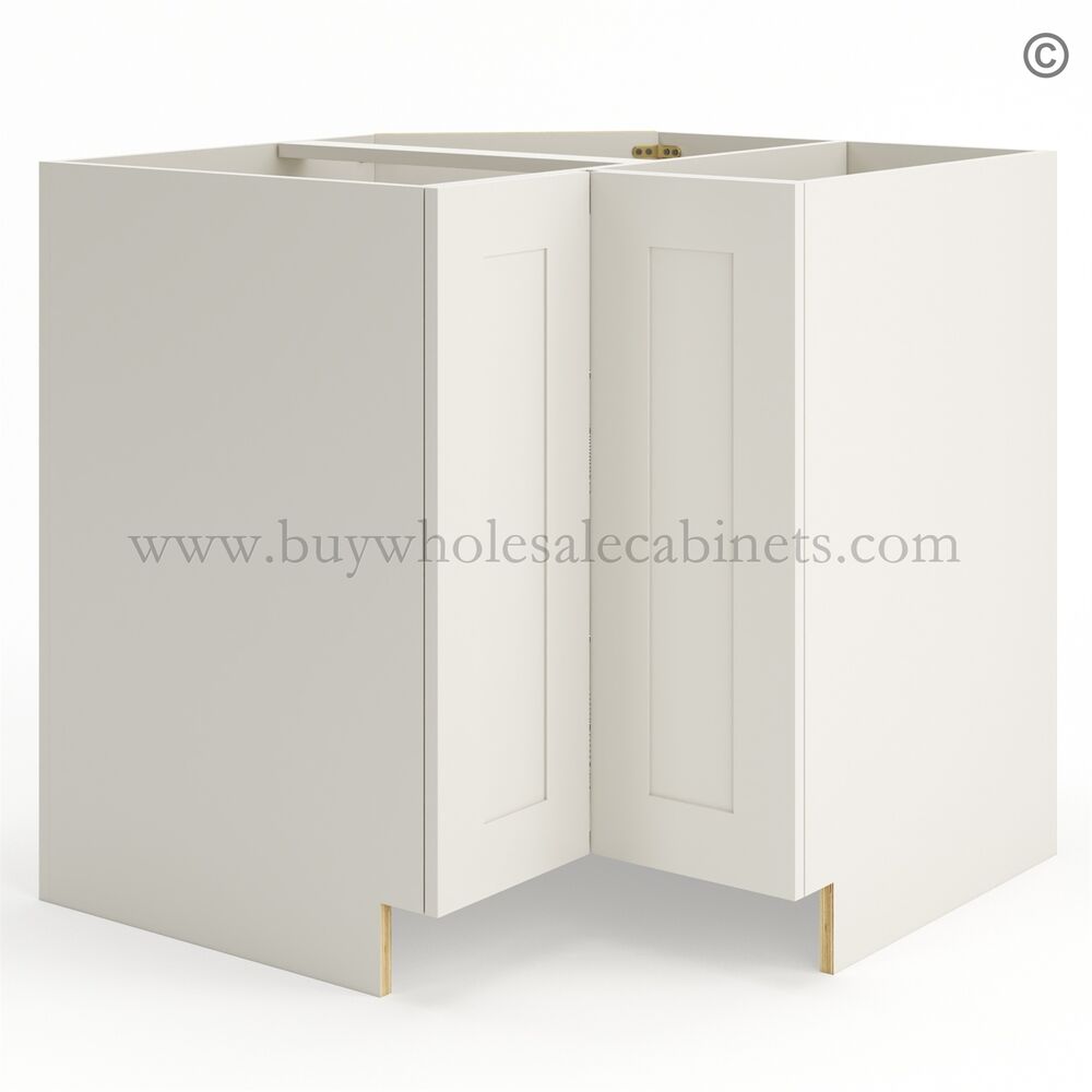 Frameless Pearl White Base Cabinet With Metal Lazy Susan, Folding Doors