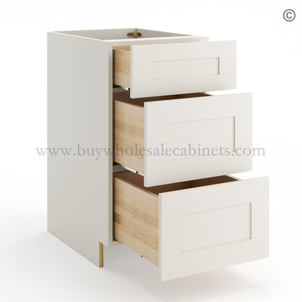Frameless Pearl White Base Drawer Cabinet with 3 Drawers is 34-1/2″ tall, 24″ deep, and available in 9 widths (12″, 15″,  18″, 21″, 24″, 27″, 30″, 33″, 36″).