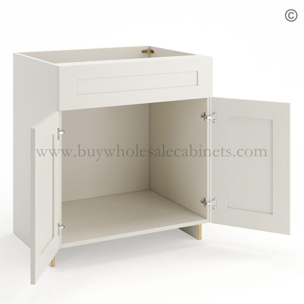 Pearl White Sink Base Cabinet with 2 Doors and False Drawer is 34-1/2″ tall, 24″ deep, and available in seven widths (24″, 27″, 30″, 33″, 36″, 39″, and 42″).