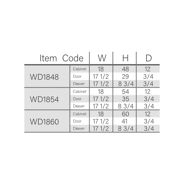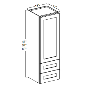 Our Gray Shaker 18 W Wall Cabinet with Two Drawers is 18″ wide, 12″ deep and available in 3 heights (48″, 54″, 60″).