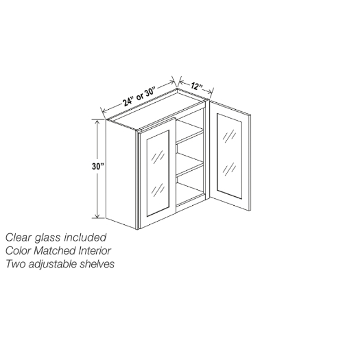 Our Gray Shaker 30 H Double Door Wall Cabinet with Glass Doors is 30″ tall, 12″ deep, and available in 2 widths (24″, 30″).