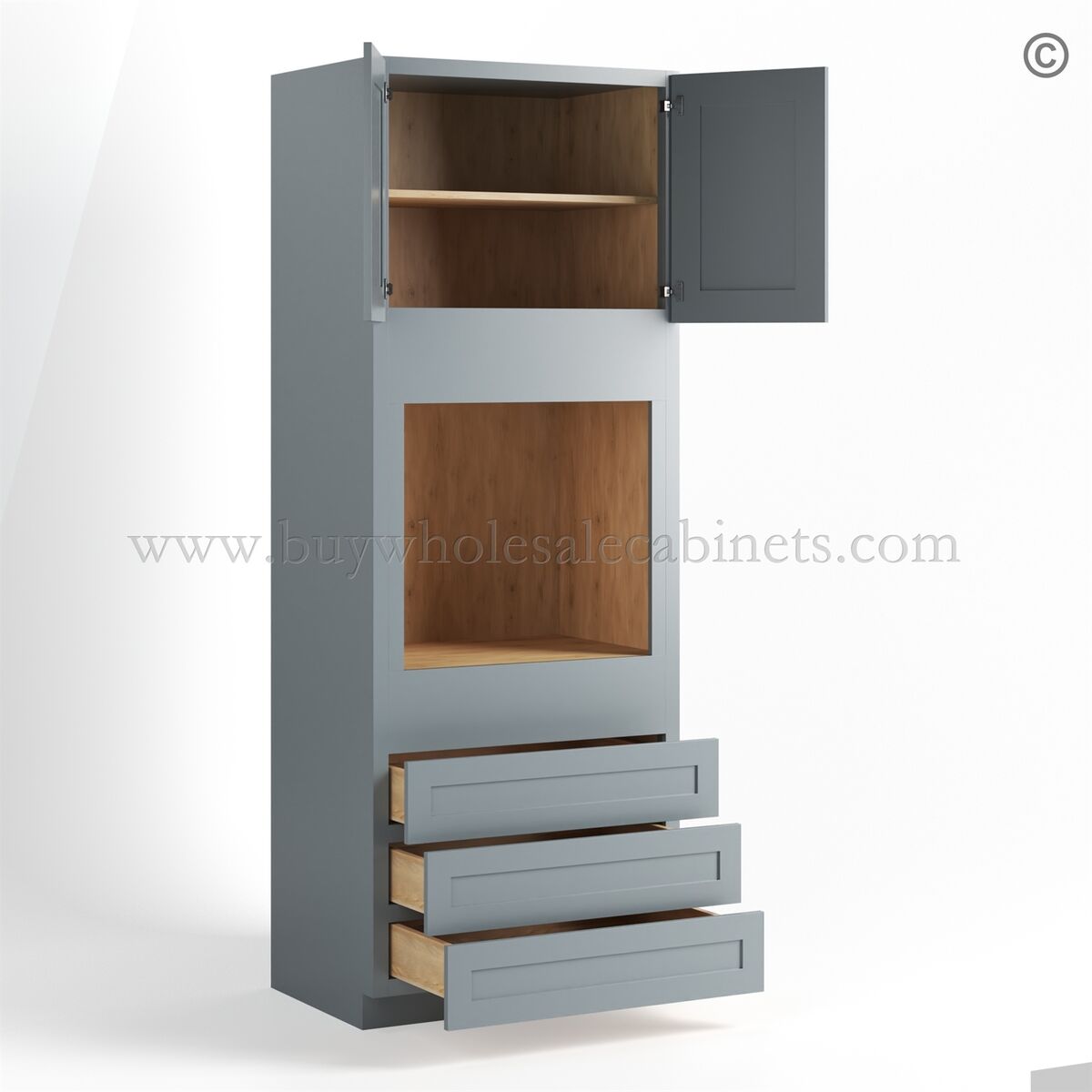 Our Gray Shaker 30″ W Oven Pantry Cabinet is available in 3 sizes.