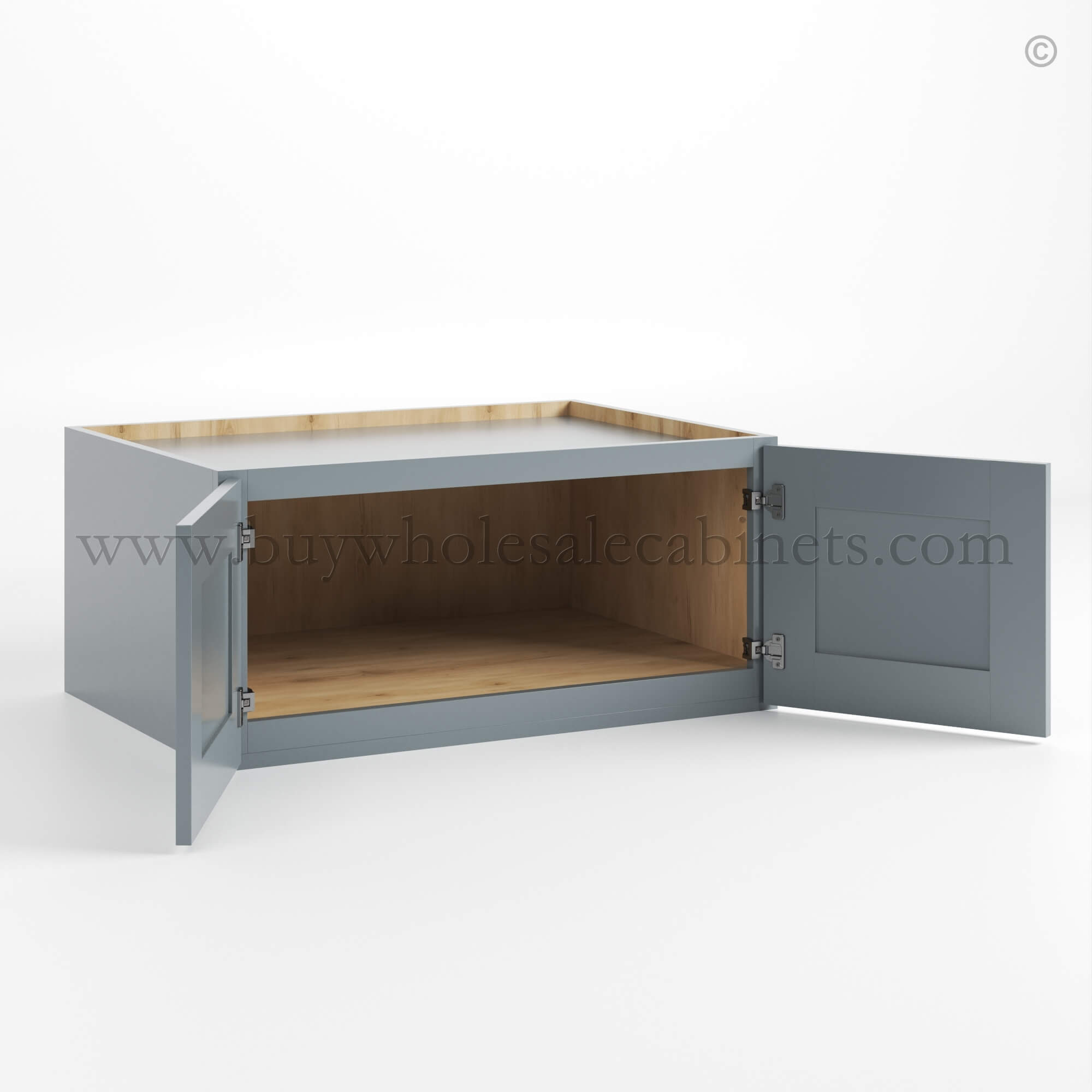 Our Gray Shaker 36 W Refrigerator Wall Cabinet 24 Deep is 36″ wide, 24″ deep, and available in 3 different heights (12″, 15″, 18″).