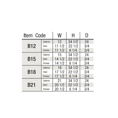 Cabinet Dimensions: 12″W x 34-1/2″H x 24″D, 15″W x 34-1/2″H x 24″D, 18″W x 34-1/2″H x 24″D, 21″W x 34-1/2″H x 24″D