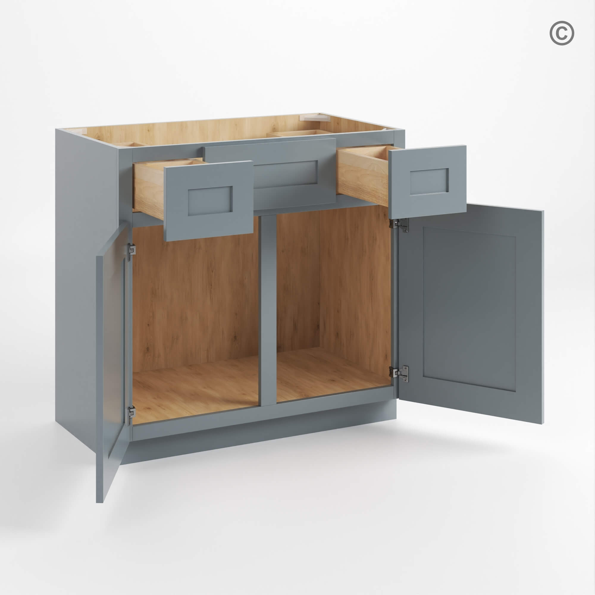 Designed for your convenience, this shaker gray vanity cabinet features European soft-close hinges, ensuring smooth and quiet operation every time on its double doors, and European soft-close full extension glides on it’s drawers. This cabinet includes one false drawer in the middle maintaining the cabinet’s aesthetic appeal while providing necessary clearance for your sink.