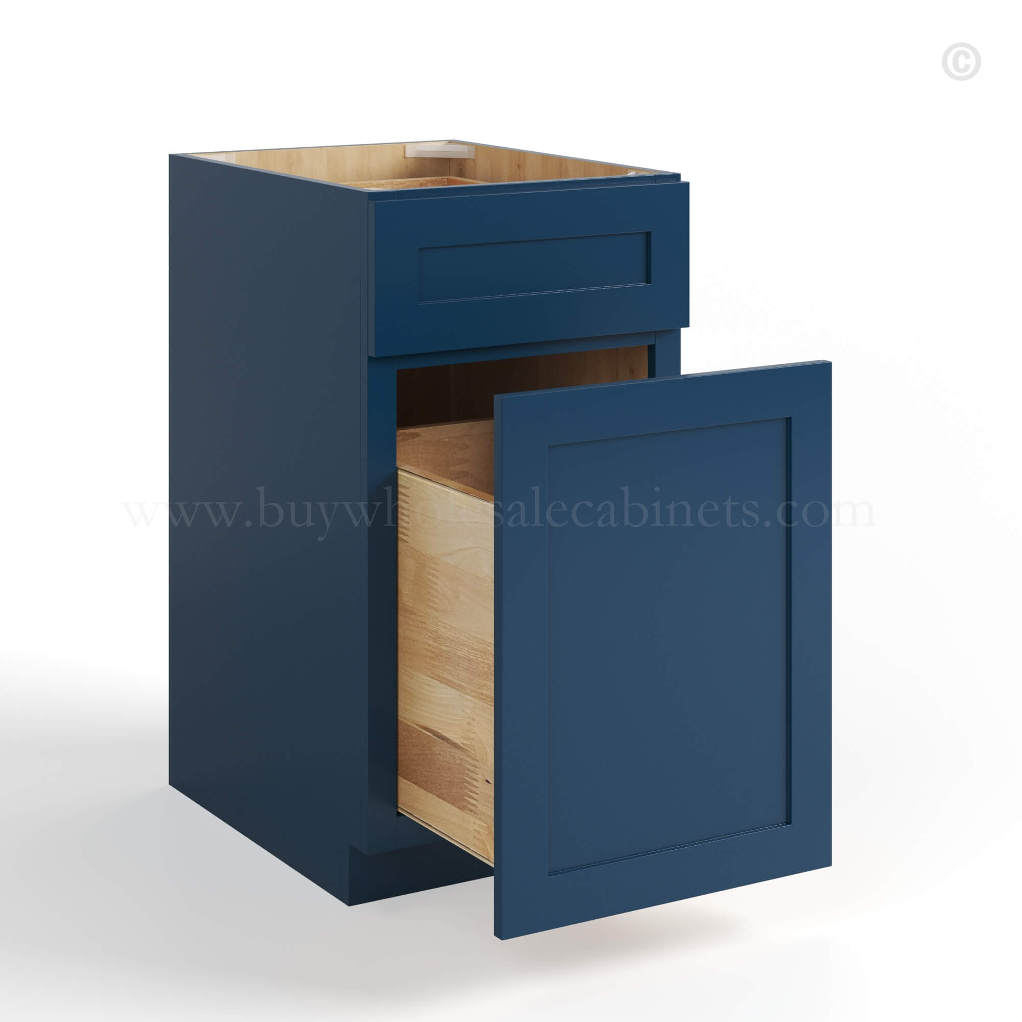 Our Navy Blue Shaker Trash Base Cabinet is 18″ wide, 34.5″ tall, and 24″ deep.