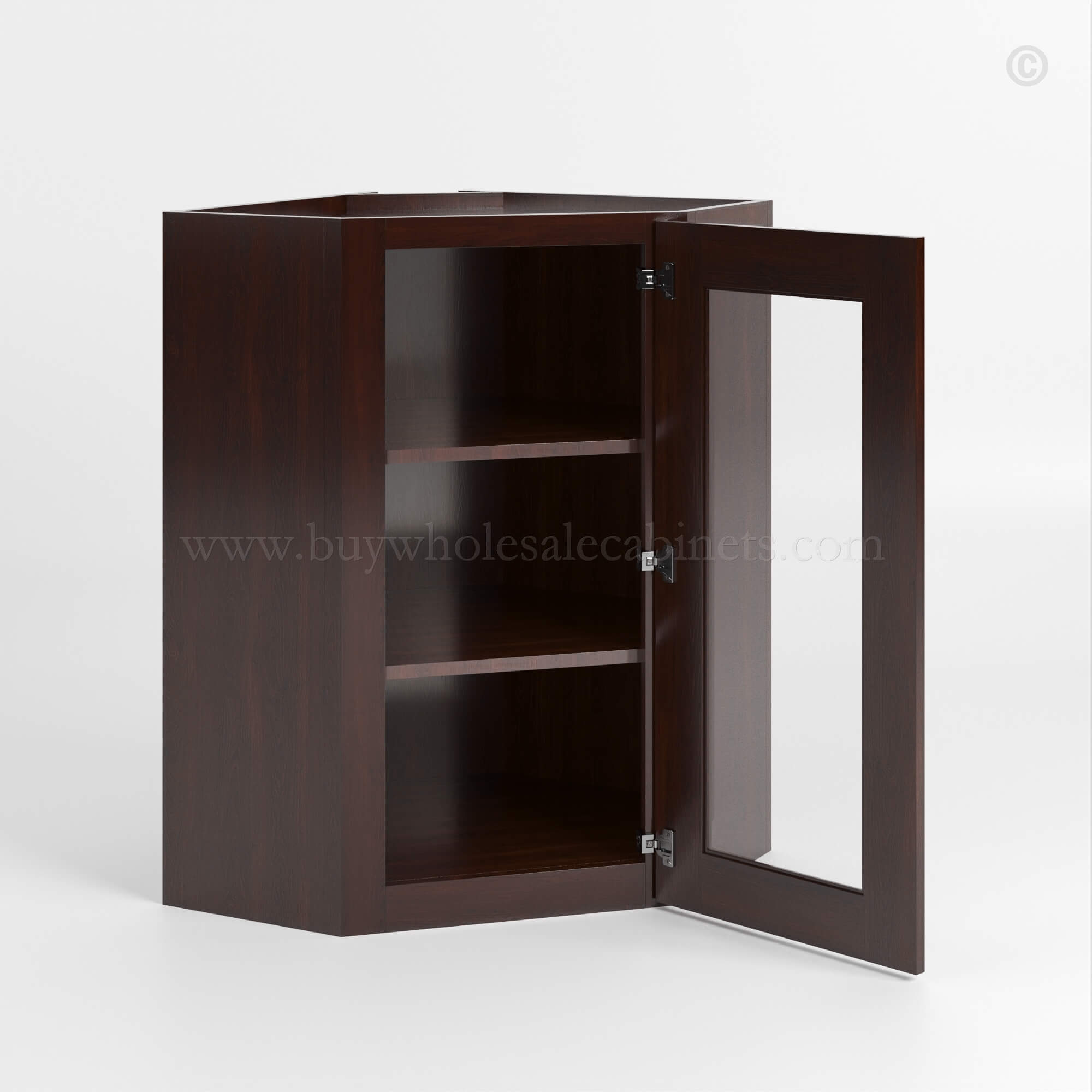 Our Shaker Espresso 24 Diagonal Corner Wall Cabinet with Glass Door is 24″ wide, 12″ deep, and available in 3 heights (30″, 36″, and 42″).