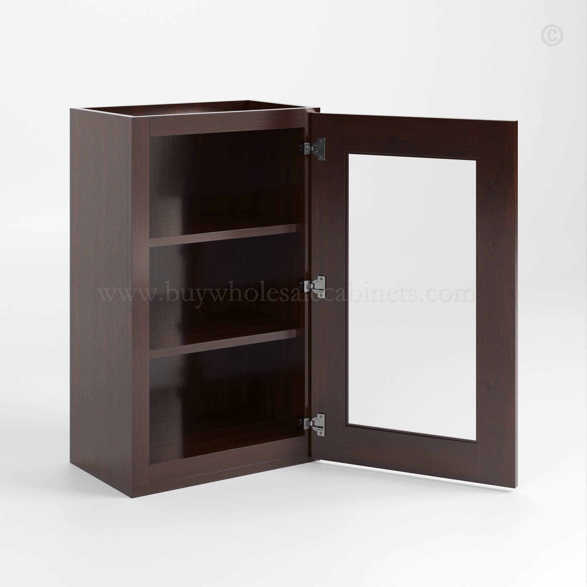 Our Shaker Espresso 36 H Single Door Wall Cabinet with Glass Door is 36″ tall, 12″ deep and available in 2 widths (15″, 18″).