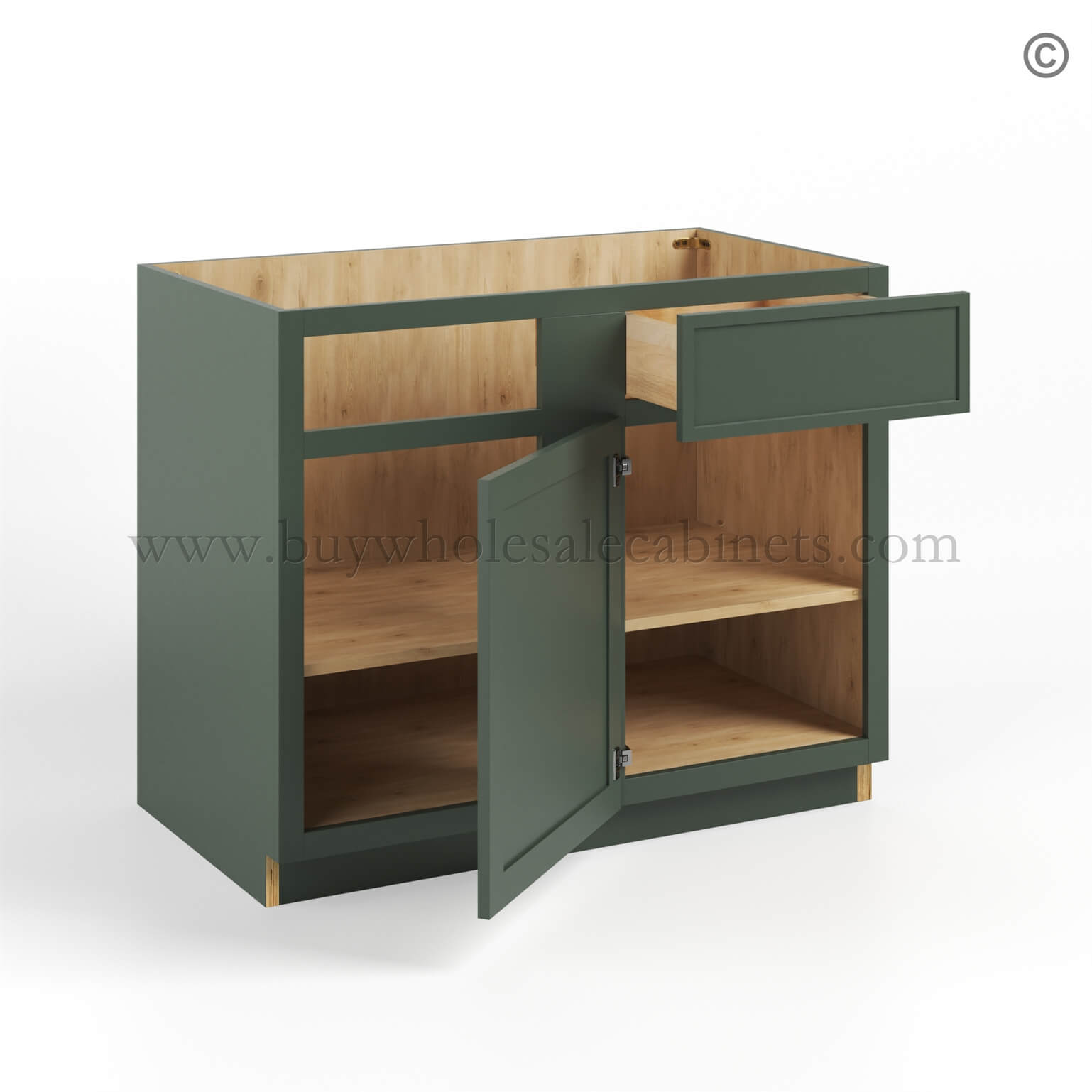 Our RTA Slim Shaker Green cabinets are finished with a high quality 7 layers of paint with a protective UV Coating and the side panels are also finished..