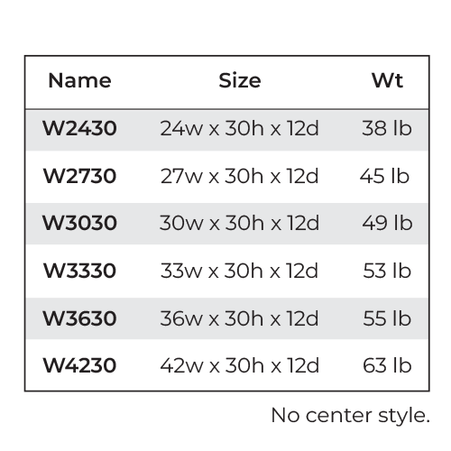 | Size | 24″W x 30″H x 12″D, 27″W x 30″H x 12″D, 30″W x 30″H x 12″D, 33″W x 30″H x 12″D, 36″W x 30″H x 12″D, 42″W x 30″H x 12″D |