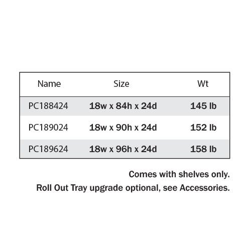 | Size | 18″W x 84″H x 24″D, 18″W x 90″H x 24″D, 18″W x 96″H x 24″D |