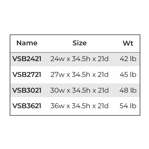 Size24″W x 34 1/2″H x 21″D, 27″W x 34 1/2″H x 21″D, 30″W x 34 1/2″H x 21″D, 36″W x 34 1/2″H x 21″D