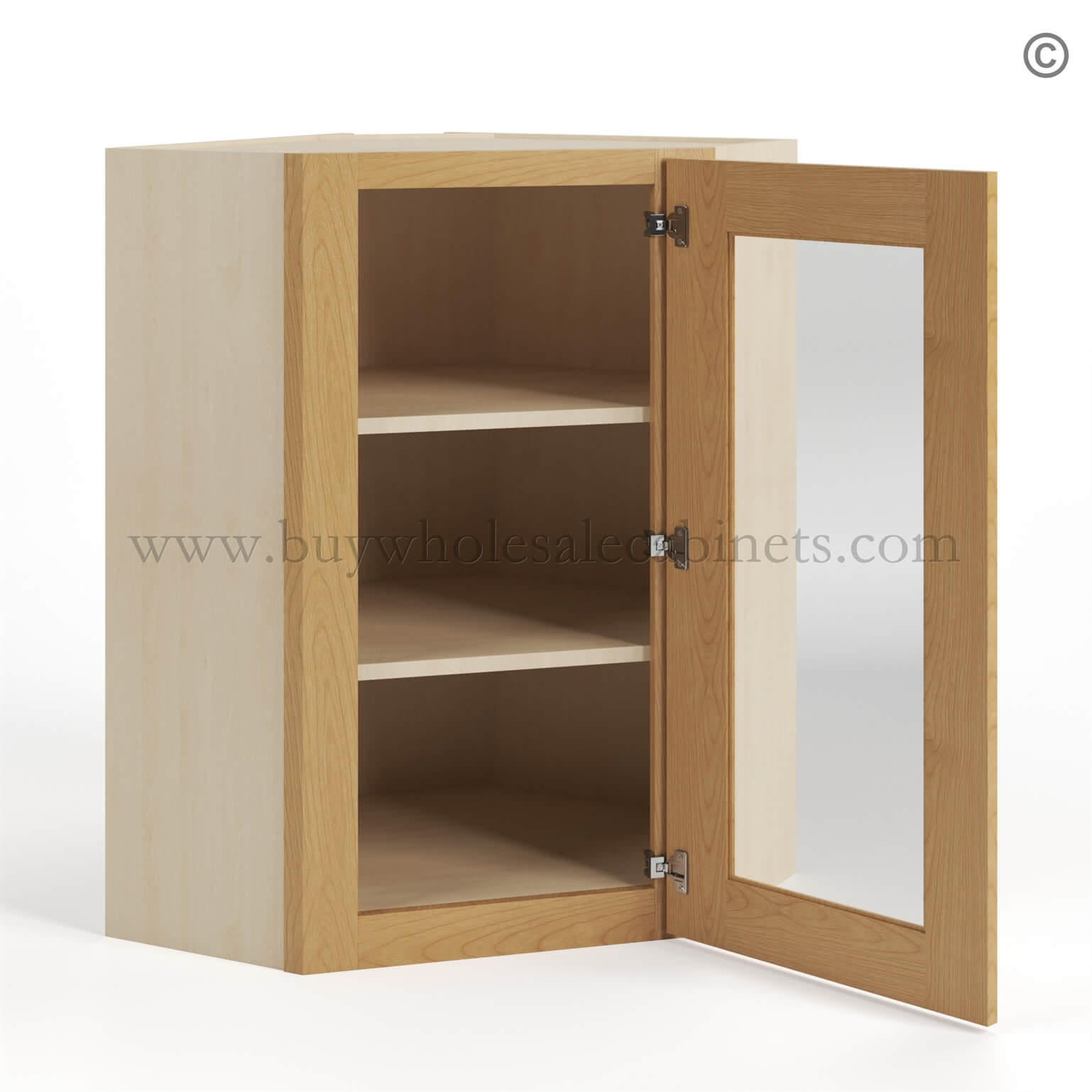 Our Treasure Chest Shaker 24 Diagonal Corner Wall Cabinet with Glass Door is 24″ wide, 24″ deep, and available in 3 heights – 30″, 36″, and 42″. This Treasure Chest cabinet will fit perfectly in your kitchen or bathroom.