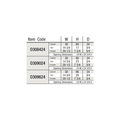 Cabinet Dimensions: 30″W x 84″H X 24″D, 30″W x 90″H X 24″D, 30″W x 96″H X 24″D