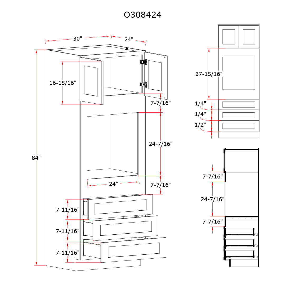 Our Treasure Chest Shaker 30 W Oven Pantry Cabinet is 30″ Wide, 24″ Deep, and available in 3 heights. This cabinet features two doors, one large open shelf, and three bottom drawers. This cabinet Treasure Chest will fit perfectly in your kitchen or bathroom.