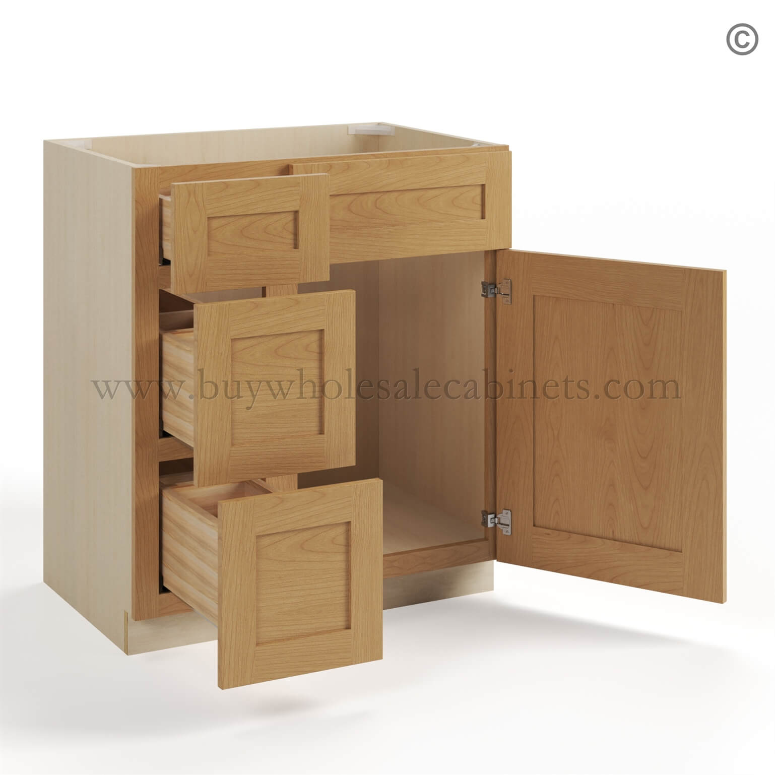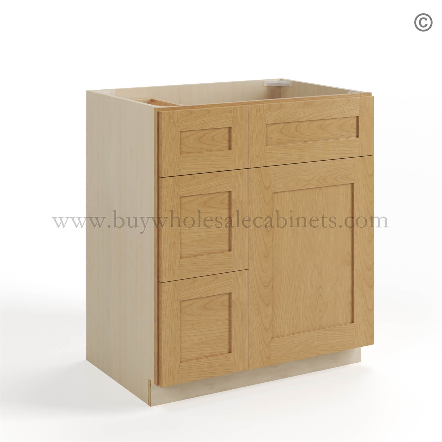 Our Treasure Chest Shaker 30 W Vanity Combo with Drawers is 34.5″ Tall, 21″ Deep, and 30″ Wide. This cabinet features 3 drawers and is available with drawers on the right or left side. This cabinet Treasure Chest will fit perfectly in your kitchen or bathroom.