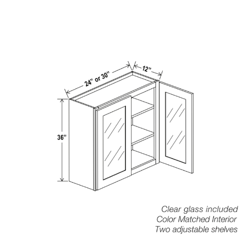 Our White Shaker 36 H Double Door Wall Cabinet with Glass Doors is 36″ tall, 12″ deep, and available in 2 widths (24″, 30″).