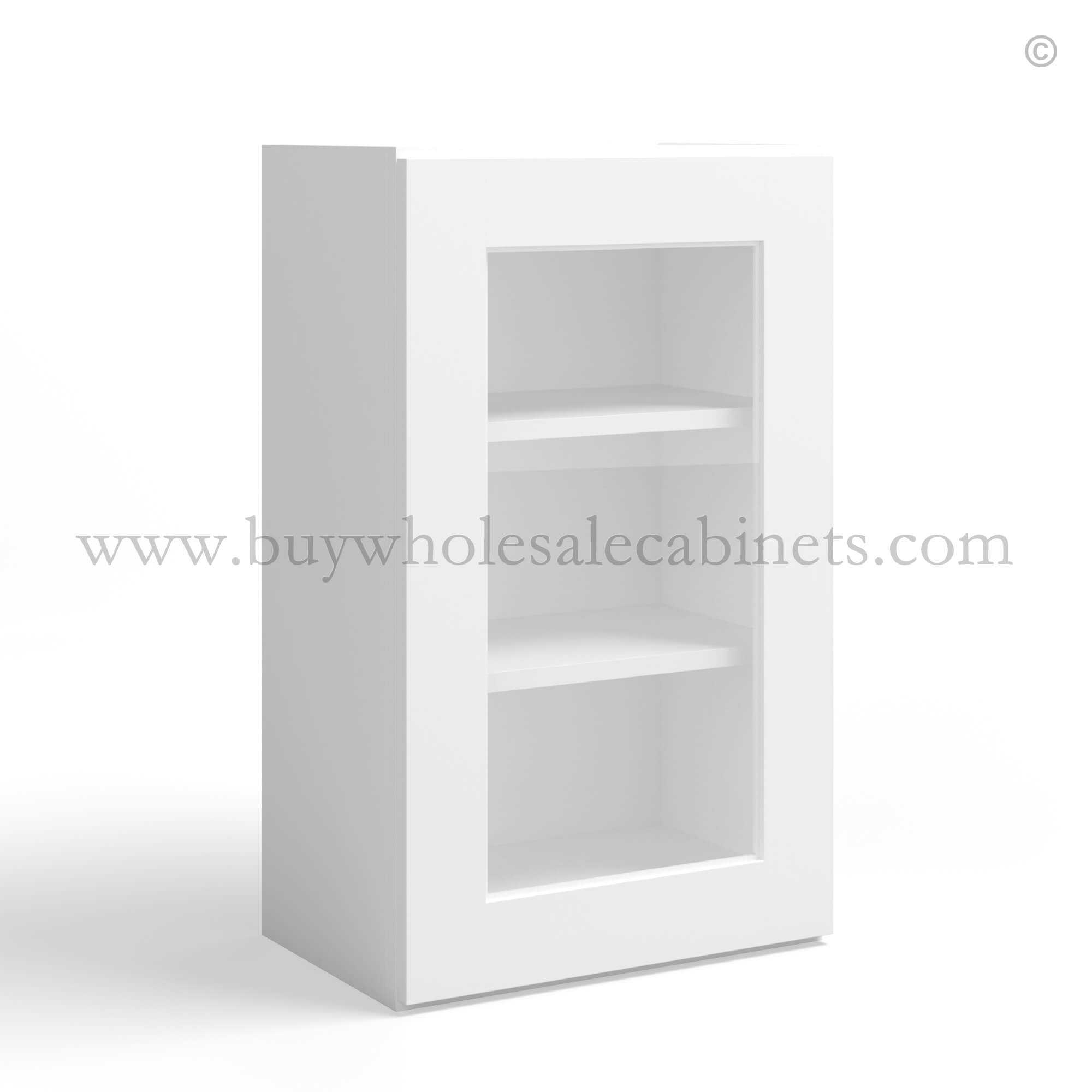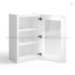 Our White Shaker 36 H Single Door Wall Cabinet with Glass Door is 36″ tall, 12″ deep and available in 2 widths (15″, 18″).