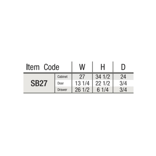 Our White Shaker Sink Base With Double Doors and False Drawer is 27″ wide, 34.5″ tall, and 24″ deep.