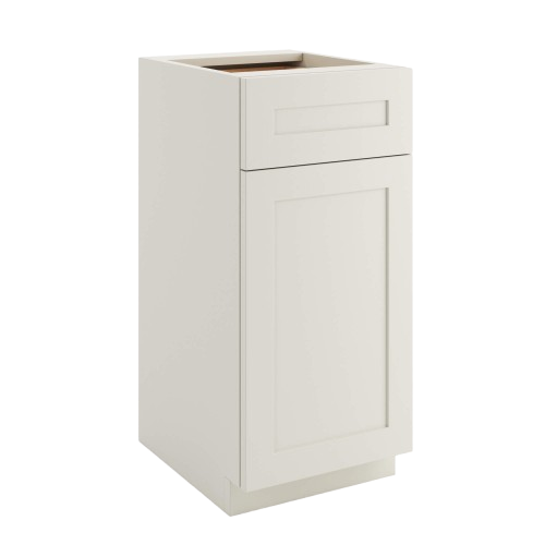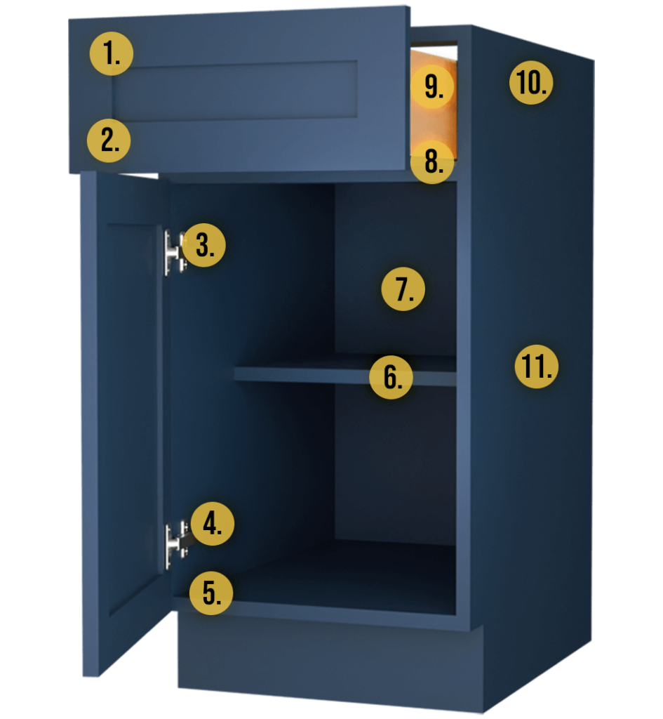 All base cabinets in this product line are provided without toe kicks. Coordinating toe kicks can be purchased in the Accessories section and are required for this cabinet line.