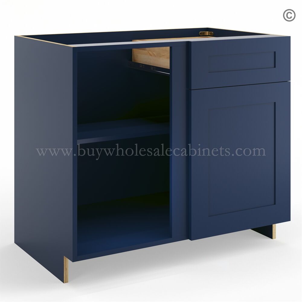 Frameless Oxford Blue Base Cabinet With Metal Lazy Susan, Folding Doors